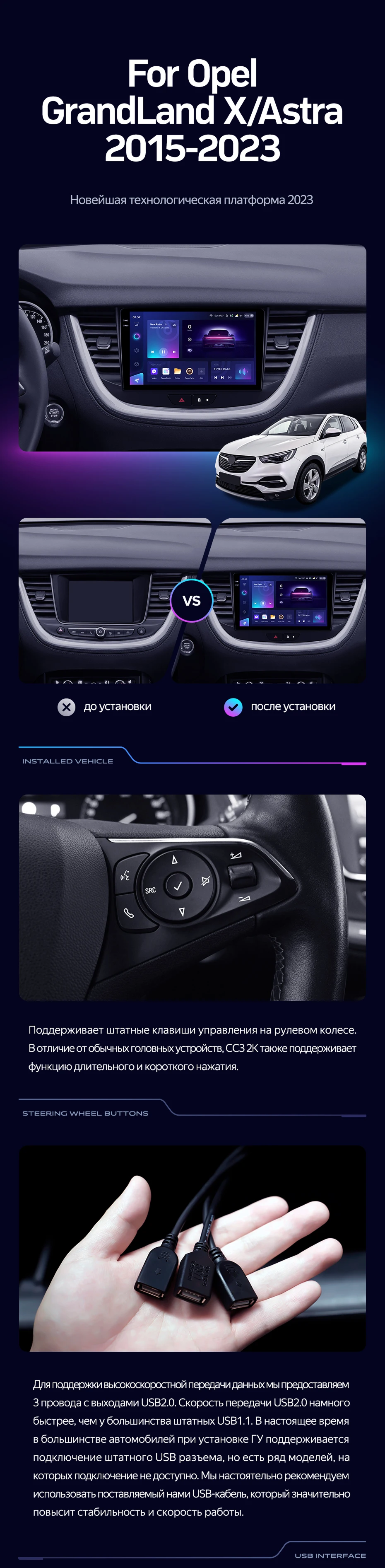 | USB | 3×USB 2.0 + USB 3.0 | Доп. аксессуары | Передняя/задняя AHD-камера, DVR-регистратор, TPMS, парковочный OBD, Type-C → HDMI |