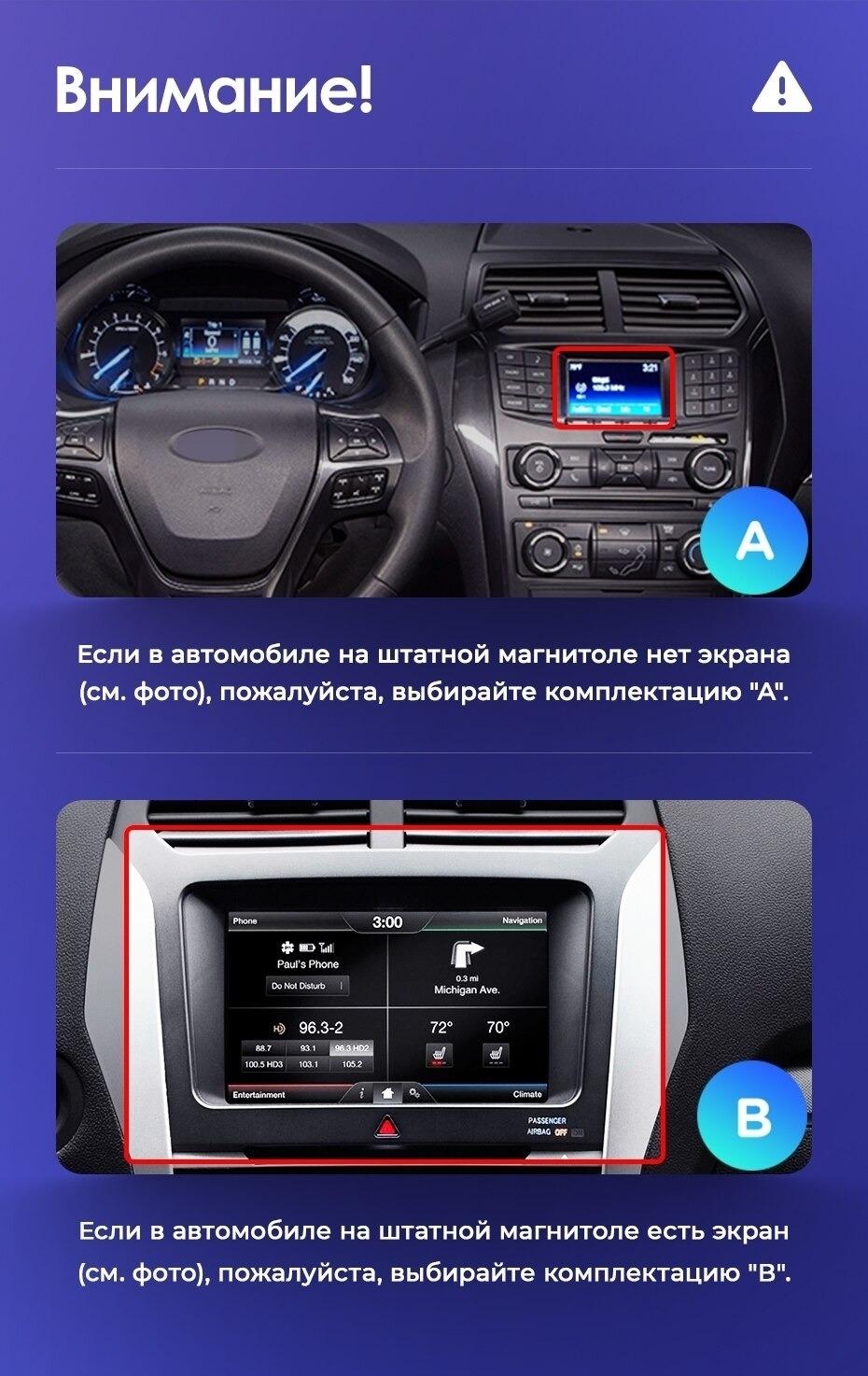 Установочный комплект для Ford Explorer 5 (2011-2019) включает переходную рамку и проводку.